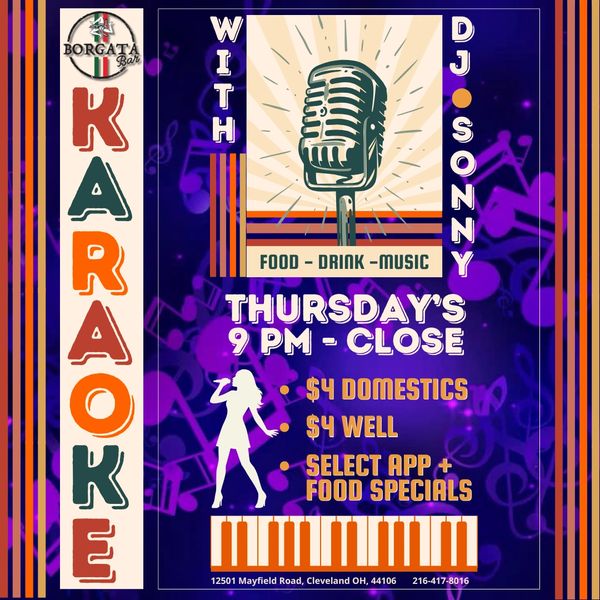 Thursday nights at Borgata Bar turn up the volume with Karaoke Night starting at 9 PM and going until close. Grab the mic, pick your favorite song, and enjoy a night filled with music, laughter, and great company.
