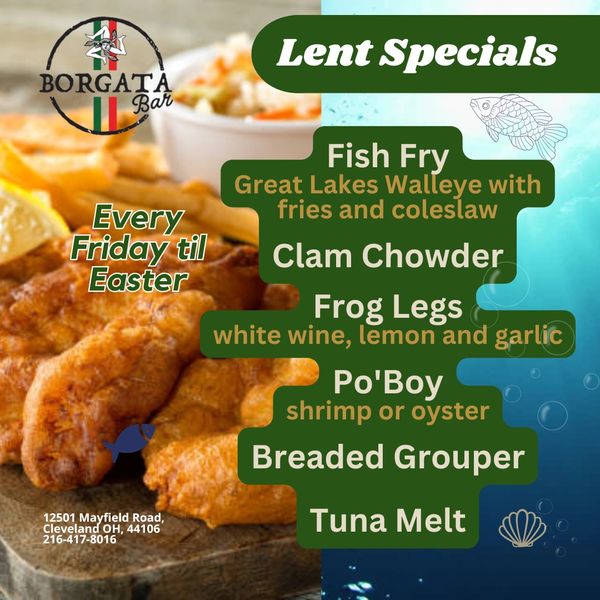 Join us every Friday during the Lenten season at Borgata Bar for a delicious lineup of seafood favorites and classic comfort dishes. Our kitchen is serving up traditional Friday fare featuring fresh fish, hearty soups, and coastal-inspired specialties perfect for the season.