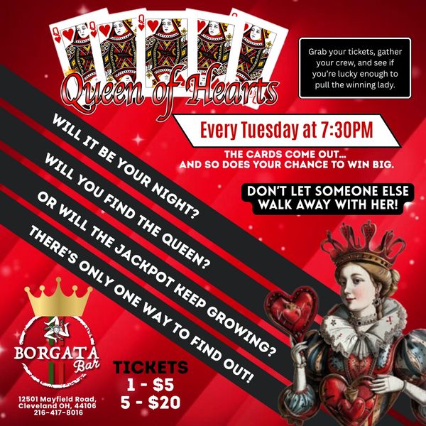 Every Tuesday night, the excitement builds at Borgata Bar with our Queen of Hearts drawing starting at 7:30 PM. Gather your friends, grab your tickets, and see if luck is on your side.